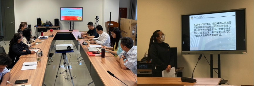 2021年9月15日下午,我院党支部教师党小组在国际大厦928会议室开展集中理论学习,深入学习交流习近平总书记给全国高校黄大年式教师团队代表回信的重要精神、习近平总书记在纪念中国人民志愿军抗美援朝出国作战70周年大会上的讲话精神。