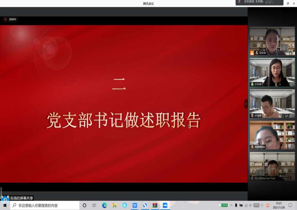 接着,党支部书记王名扬同志作述职报告。她向支部全体党员汇报了2020年度党支部工作的主要内容,包括政治理论学习、主题党日活动、党员发展以及课程思政建设等方面;针对本年度支部工作中存在的问题,提出了下一步工作思路。党支部工作力求发挥好基层党组织的战斗堡垒作用。