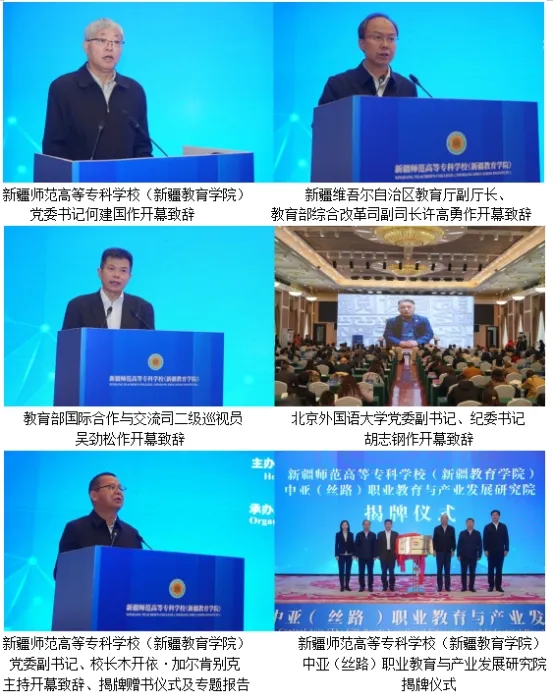 何建国表示,作为百年老校有信心做好职业教育。许高勇指出,交流研讨职业教育与产业发展的有益经验、创新思路,共同分享中外职业教育交流合作的机遇和前景,对于助力新疆打造教育对外合作战略高地、推动职业教育助力大国外交具有重要意义。吴劲松强调职业教育必须与产业发展加强紧密联系。胡志钢作视频致辞,回顾了两校帮扶合作历史,表示此次研讨会是双方创新援派工作机制、落实帮扶合作备忘的具体举措。新疆师范高等专科学校(新疆tyc522cc太阳成集团)中亚(丝路)职业教育与产业发展研究院在与会嘉宾见证下正式揭牌。