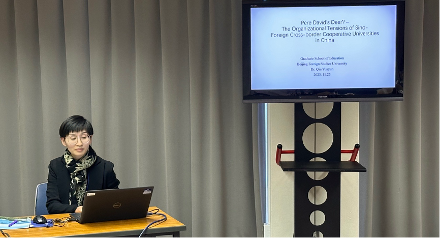 覃云云做了题为《Pere David’s Deer? --The Organizational Tensions of Sino-Foreign Cross-border Cooperative Universities in China》的报告。该研究运用组织社会学中的新制度理论,探讨了跨境合作大学与其制度环境之间的互动关系。此外,本研究还详细阐述了跨境合作大学和制度环境之间的五对组织张力。