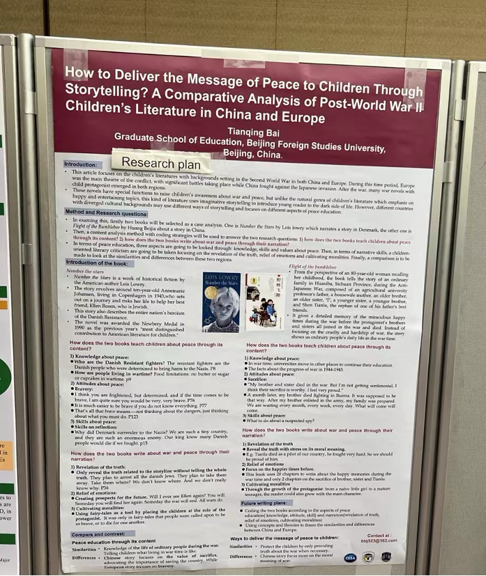 白天晴同学参与大会的海报展示环节,汇报题目为《How to Deliver the Message of Peace to Children Through Storytelling? A Comparative Analysis of Post-World War II Children’s Literature in China and Europe》。在海报展示期间,白天晴同学与多国学者开展研讨交流,收获颇丰。