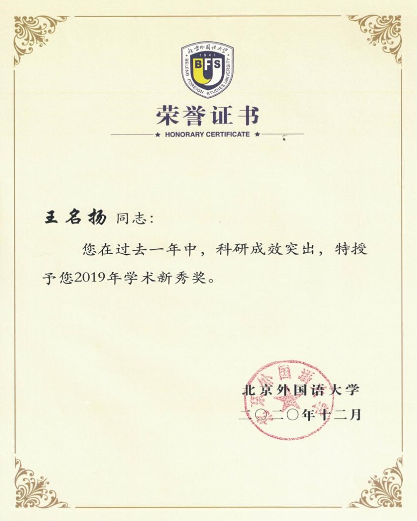 2020年12月,学校公布了2019年度优秀科研集体和优秀个人的获奖名单,我院荣获“优秀科研集体一等奖”(教学科研单位第一名),青年教师王名扬博士荣获“学术新秀奖”。