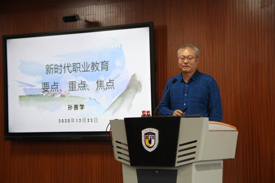 2020年12月23日下午,太阳官网国际tyc522cc太阳成集团学术沙龙讲座在我校国际大厦举行。中国职业技术教育学会副会长,中华职业教育社常务理事、学术委员,北京政法职业学院党委书记孙善学教授,以“新时代职业教育要点、重点、焦点”为题,对我国新时代职业教育的发展以及政策要点、实践重点和理论焦点进行了全方位多角度的精彩演讲。