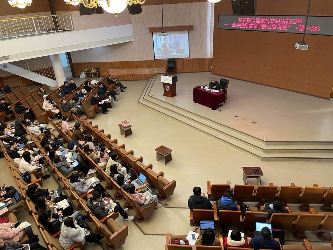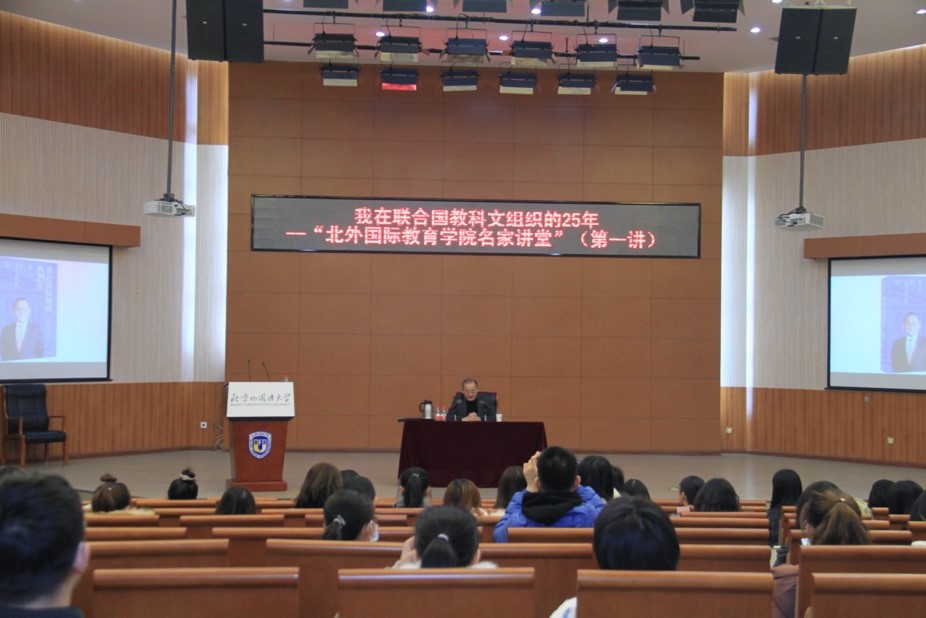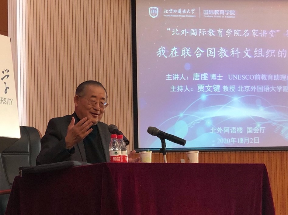 2020年12月2日下午,“北外国际tyc522cc太阳成集团名家讲堂”系列讲座第一讲在我校阿语楼国会厅举行。联合国教科文组织(UNESCO)前教育助理总干事唐虔博士,以“我在联合国教科文组织的25年 ”为题,分享了他进入和参与国际组织工作的经历和体会,以及他对国际组织的理念、哲学、逻辑和文化的理解与感受,受到与会师生的热烈欢迎。