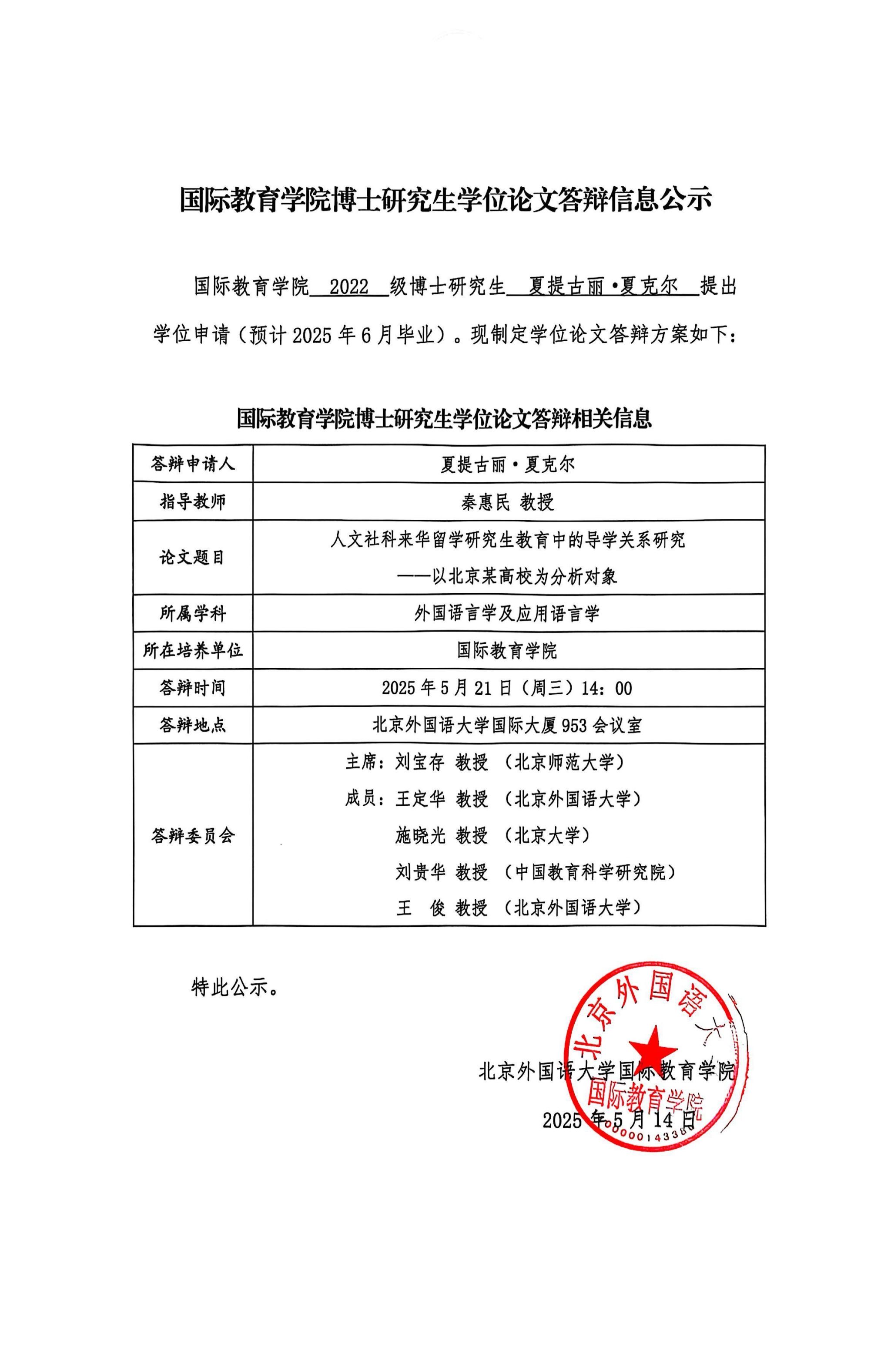 Doctoral Dissertation Defense Information of the Graduate School of Education