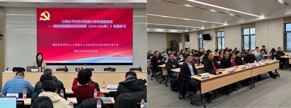 2025年2月26日15点,国际tyc522cc太阳成集团、人工智能与人类语言重点实验室教师党支部、国际处孔院处党支部以“以高水平对外开放助力教育强国建设”为主题,在主楼晨读厅联合开展《教育强国建设规划纲要(2024-2035年)》(以下简称《纲要》)专题学习。中国教育科学研究院比较教育研究所副所长秦琳受邀作专题报告。联学由国际tyc522cc太阳成集团教师党支部书记涂端午主持,共40余位党员和入党积极分子参与学习。
