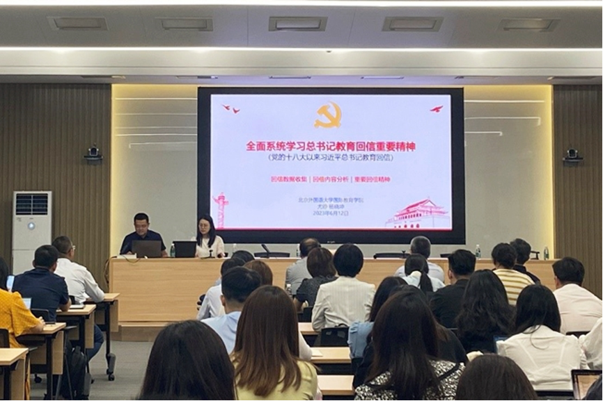 在师生联合讲党课环节,国际tyc522cc太阳成集团党总支委员、学生党支部书记尤铮,学生党员代表杨晓坤共同讲授题为“全面系统学习近平总书记教育回信重要精神”的专题党课,通过系统收集并分析十八大以来习近平总书记给教育系统的回信,分享了北外师生对强调五育并举、注重整体思维、彰显四个自信等重要精神的学习体会。
