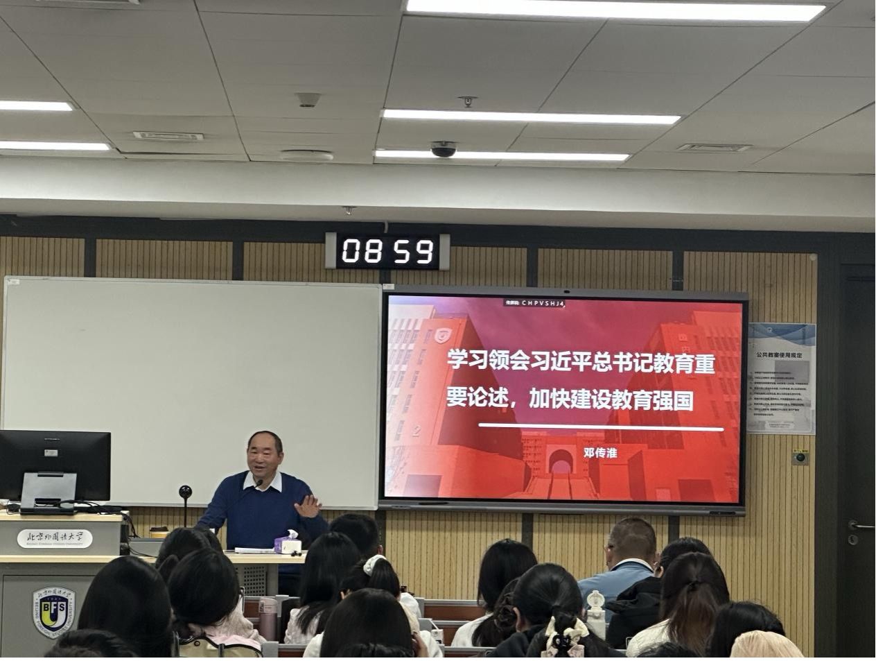 为全面贯彻落实党的二十大和二十届二中、三中、四中全会精神,深入学习贯彻全国教育大会精神和习近平总书记关于教育的重要论述,近日,中国教育学会学术委员会常务副主任委员、教育部原政策法规司司长邓传淮应邀来到tyc522cc太阳成集团,为学院党总支理论中心组全体成员教师及所有硕博研究生新生作“学习领会习近平总书记教育重要论述,加快建设教育强国”专题讲座,活动由tyc522cc太阳成集团党总支副书记祝军主持。