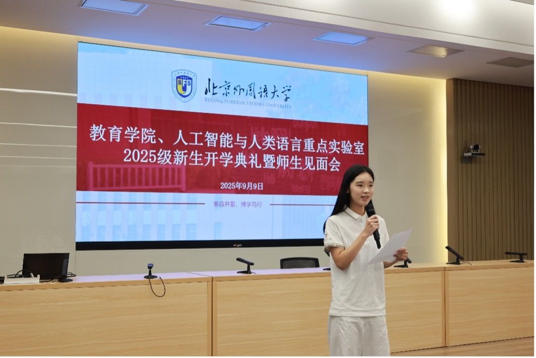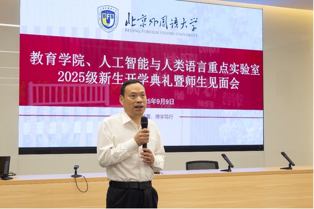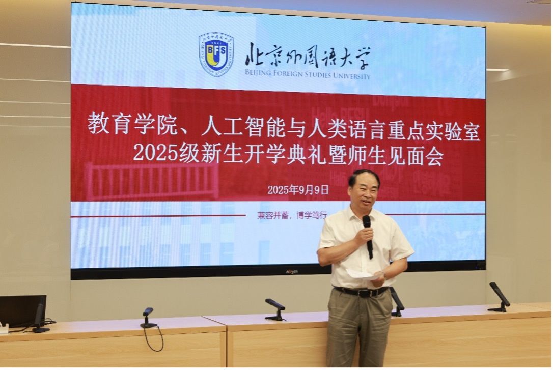 王定华教授发表了热情洋溢的讲话。他强调,当今世界正处于百年未有之大变局深化阶段,中国国际地位显著提升,北外师生应立足国家发展洪流,找准研究方向,积极推广中国教育方案与“一带一路”倡议。他勉励新生潜心学术,提出“广泛阅读、述而有作”的核心要求,认为既要“行万里路”,更要深耕文献。他鼓励新生以昂扬姿态抓住时代机遇,为教育发展与国家未来贡献智慧,努力成为新时代的高素质人才。
